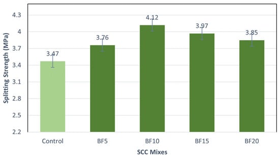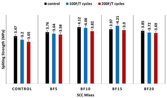 The splitting strength decreased by 11.5% after exposure to 400 °C in the control specimens, 3.5% in the BF5 specimens, 3.1% in the BF10 specimens, 2.7% in the BF15 specimens, and 2.9% in the BF20 specimens, as compared to specimens exposed to 23 °C. The control, BF5, BF10, BF15, and BF20 specimens’ splitting tensile strength decreased by 18.2%, 5%, and 3.9%, respectively, after 600 °C, compared to the 23 °C specimens.