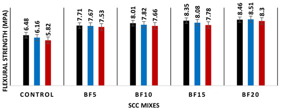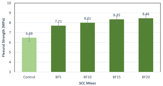 After exposure to 400 °C, the flexural strength of basalt fibers at 0.05%, 0.1%, 0.15%, and 0.2% increased by 30.2%, 35.1%, 40%, and 33.8%, respectively, compared to the control specimen. However, when compared to the control specimen at 0.05%, 0.1%, 0.15%, and 0.2%, respectively, the flexural strength of basalt fibers increased by 27.5%, 31.3%, 32.8%, and 30%, respectively, at 600 °C. When the proportion of basalt fibers was increased to 0.15%, the flexural strength of SCC specimens increased, but it decreased with further addition of basalt fibers.