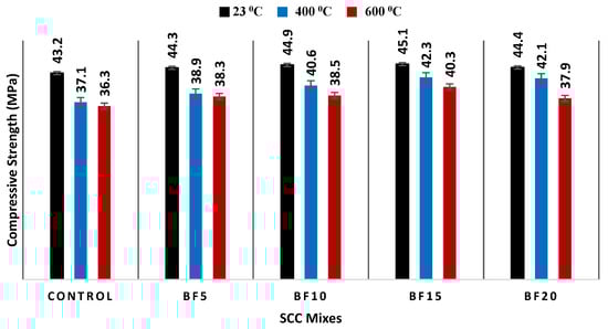 Ref. [25] studied the compressive strength of self-compacting concrete under elevated temperatures. After 28 days of curing, the specimens were kept at 200 °C, 400 °C, 600 °C, and 800 °C temperatures for two hours. It was established that compressive capacity decreased with an increase in temperature. Also, there was a drastic reduction in strength at both 600 °C and 800 °C. The percent variation of resilience strength of self-packing concrete at 200 °C, 400 °C, 600 °C, and 800 °C was found to be 3.15%, 10.88%, 43.39%, and 51.36%, respectively, relative to the controlled concrete. Ref. [26] investigated the mechanical performance of self-compacting concretes (SCCs) under both room and high temperatures. Their findings revealed that the relative compressive strengths measured at 120 °C and 600 °C for all the SCCs studied were lower than those determined for conventionally vibrated concretes. Additionally, increasing the volume of cement paste resulted in a notable reduction in the relative compressive strength at 250 °C, 400 °C, and 600 °C. The water–binder ratio had minimal impact on the relative compressive strength of the SCCs studied at high temperatures.