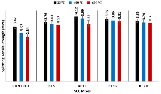 The effect of high temperatures (23 °C, 400 °C, and 600 °C) on the splitting tensile strength of SCC specimens.