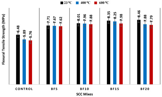 The effect of high temperatures (23 °C, 400 °C, and 600 °C) on the flexural tensile strength of SCC specimens.