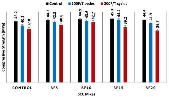 The compressive strength test was performed after subjecting cylindrical specimens (100 mm × 200 mm) to freeze and thaw cycles according to the ASTM C666-A [37] standard specification. Table 7 and Figure 16 show the maximum compressive strength of specimens following exposure to 100 and 200 freeze-thaw (F/T) cycles. All data in the table or figure below are the average of at least three test results for the same condition.