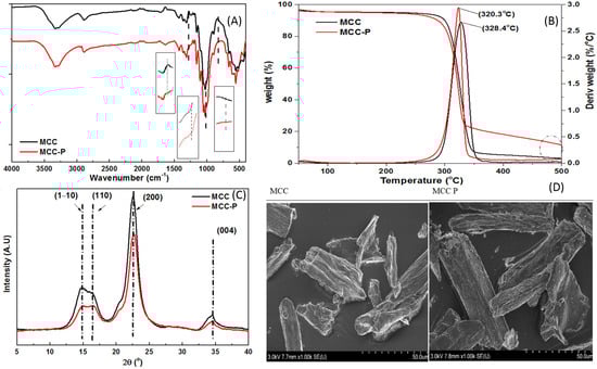 Characterization of unmodified and modified MCC (A) FTIR spectra, (B) TGA/DTG thermograms, (C) XRD spectra, and (D) SEM micrographs.