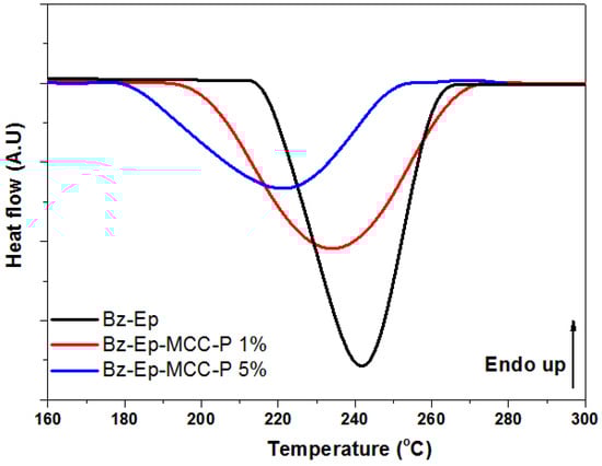 DSC studied the curing process of the Bz-Ep copolymer and its MCC-P-reinforced composites, and the resulting thermograms are depicted in Figure 2. The non-isothermal runs were performed at a rate of 15 °C/min for the prepared mixtures before curing.