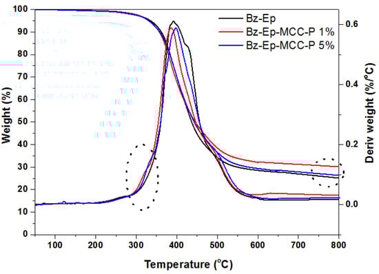 From the TGA curves, the composites show enhanced thermal behavior within the temperature range from 300 °C to 800 °C compared to the neat Bz-Ep baseline. This enhancement is attributed to the residual char yield of composites that is higher than that of a neat copolymer. This increase is explained by the fact that the formed char deposit behaves as an insulator to shield the matrix from decomposition [46]. It is also noteworthy to mention that at 5% loading of MCC-P, the composite showed a slightly lower thermal stability, which might be related to the high amount of MCC that decomposes earlier, thus reducing the char yield.