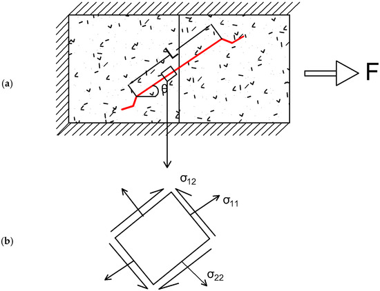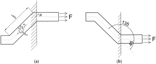 In Figure 2a, where the straight shank axis of a pre-bent fibre lies with an inclination θ to an applied tensile stress σ = F/A, a plane stress state (Equations (1)–(3)) exists within the fibre. Correspondingly, the fibre’s off-axis failure criterion for the plane stress state, shown in Figure 1b and Figure 2a, appears in a non-dimensional form [25]: