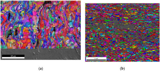 Rolled sheet and cold-drawn metal wire have similar characteristics to those in Figure 3a, but to a lesser degree. Thus, in the plane 2B3 of the fibre cross-section shown in Figure 3b, the polycrystalline grains appear equiaxed and isotropic. However, in the extruded or cold-drawn direction (planes 1B2 and 1B3), elongated grains exhibited direction-dependent properties similar to a unidirectional reinforced composite. Hence, a transversely isotropic failure criterion was assumed for the fibre, which was deep-drawn to its final diameter (0.9 mm), having had its grains elongated by multiple reductions. Metallography revealed (see Figure 4a) elongated grains aligned with the fibres drawn in direction one, with an aspect ratio exceeding five. Figure 4b shows less directionality within a cross-section of an isotropic plane of the cross-section. The equiaxed grains that appeared had an average diameter of approximately 2 μm. Clearly, there were variations in grain size, but these did not appear in the macroscopic plasticity theory required for (i) a shank failure criterion at ultimate strength and (ii) straightening the fibre’s hooked ends during pull-out from the matrix.