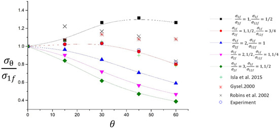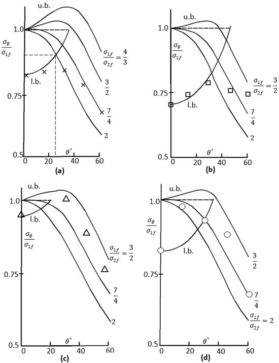 giving, in Figure 6a, θc ~ 25° and σθ/σ1f ~ 0.9, where an aligned fibre intercept value σ0°/σ1f = 0.82 applies to σ1f/σ2f = 2, as shown. In a similar manner, other data (see Figure 6b–d), taken from the literature [26,27,28], lie between the two bounds when normalised with σ1f. Note: the nominal, critical applied stress ratio in Figure 6a–d interchanges directly with the ratio between the maximum pull-out/fracture force Fθ and the ultimate tensile force F0° for a 0° fibre with diameter d. That is:
