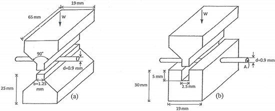 High-tensile drawn wire is usually supplied with its strength and ductility properties aligned with the length direction. Equation (6) shows that in addition to the axial strength σ1f, the transverse strength σ2f and shear strength σ12f are necessary for an off-axis failure prediction. The wire is usually supplied with its uniaxial tensile strength only, denoted here as σ1f. It is most convenient to establish σ2f and σ12f from transverse compression and double shear tests using indenters between guides, as shown in Figure 7a,b, respectively. In the absence of hardening for a high strength 0.9 mm alloy steel wire (supplier Bekaert Dramix, Belgium), the minimum ultimate transverse strength σ2f is estimated from the load WE at full elastic compression: