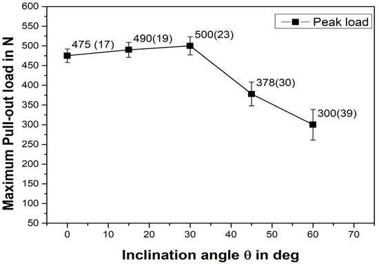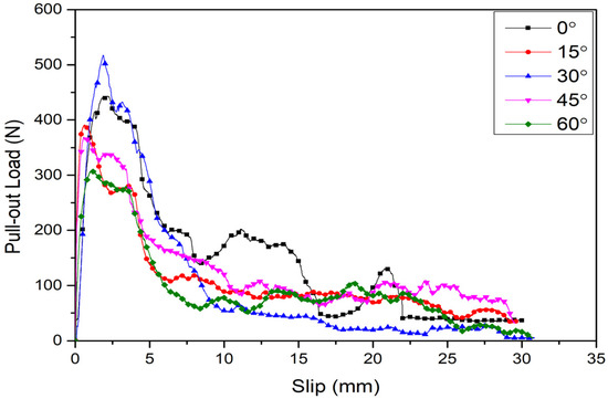 Figure 8 shows the effect of inclination angle on the maximum pull-out load (Fθ) of inclined hooked-end fibres with the following inclinations: 0°, 15°, 30°, 45° and 60°. The mechanisms governing the pull-out behaviour of inclined hooked-end fibre were found to be similar to those in aligned straight fibres. These were initial debonding, followed by unbending, then frictional pull-out of the straightened fibre. First, the force applied overcame a chemical bonding and frictional resistance from the interface to the fibre. Slip occurred when an increased force released the mechanical anchorage provided by the hooked end. The unbending required for this release involved plastic deformation within hinges that formed successively at each bend of the fibre hook. When straightened, the complete pull-out of the fibre occurred under a much lower force that equated to the remaining sliding friction. The mechanical anchorage contribution provided by a hooked-end fibre significantly increased the pull-out load after debonding. In contrast, following the debonding of an embedded straight fibre, only frictional resistance remained to be overcome under a falling load. The pull-out load versus slip responses shown in Figure 8 reveal the load variations found from separate pull-out tests upon hooked-end fibres at five different orientations.