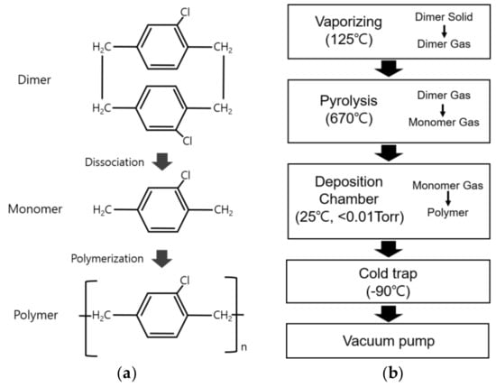 Parylene-C coating based on chemical vapor deposition (CVD). (a) Chemical structures of parylene-C in CVD; (b) procedure of parylene-C coating in this study.