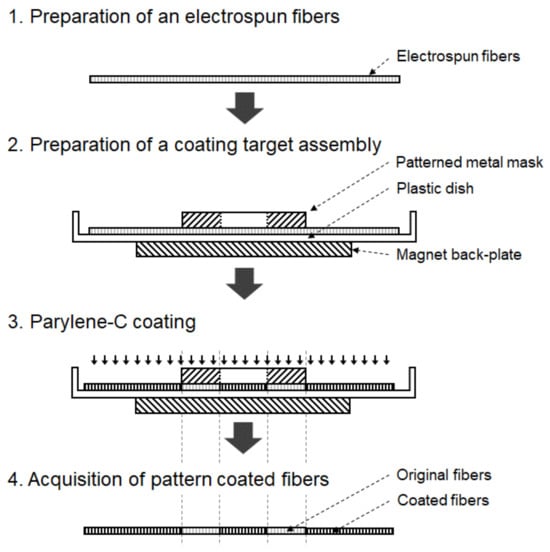Conventional pattern coating methods utilizing adhesive or photo-resist (PR) masks can potentially cause damage to nano- or microfibers. Therefore, in this study, a novel method for masking electrospun fibers using a magnet back-plate and a patterned metal mask was developed. Electrospun fibers are clamped between a magnet back-plate and a patterned metal mask, which are placed in a vacuum chamber, followed by parylene-C coating. Figure 2 shows the schematic diagram of the parylene-C pattern coating procedure for electrospun fibers with the help of magnet–metal masking.