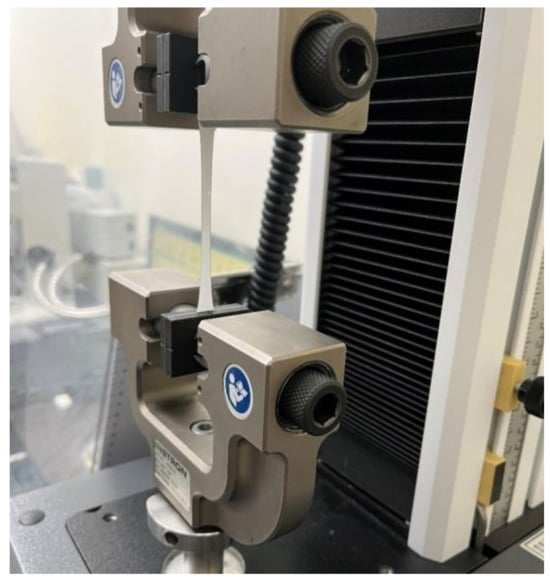 To identify the mechanical properties of the original PCL electrospun microfibers and the parylene-C-coated ones, tensile tests were carried out using a universal testing machine (Instron Corp., Norwood, MA, USA) (Figure 3). Fiber mesh samples were cut to a gauge length of 50 mm and a gauge width of 10 mm. The tensile test was performed three times at a crosshead speed of 5 mm/min, and then, the stress–strain curves and elastic moduli were calculated from the force–displacement data obtained.