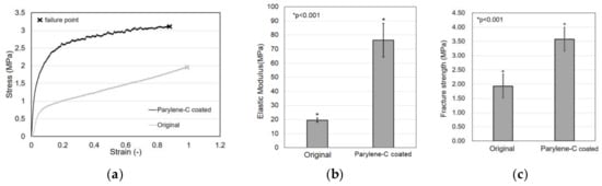 Tensile test results. Comparison of stress–strain curve (a), elastic modulus (b), and fracture strength (c) between the original and parylene-C-coated electrospun PCL microfibers.