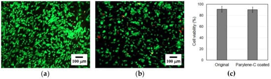 Among the cells attached to the original and the parylene-C-coated PCL electrospun microfibers, 91.05% and 90.11% were live cells, respectively (Figure 8c). The difference in the percentage of live cells between the original and parylene-C-coated PCL electrospun microfibers is negligible and not statistically meaningful. Therefore, it can be concluded that the parylene-C coating does not cause a deterioration in the cell viability of the electrospun PCL microfibers. Moreover, stable cell settlement could be observed even 24 h after seeding, demonstrating excellent cell adhesion quality in both the original and the parylene-C-coated electrospun PCL microfibers.