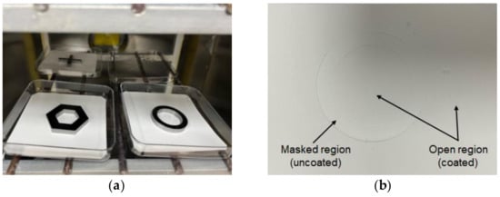 In recent years, parylene-C has garnered significant attention as a coating material for enhancing the properties of various substrates, particularly in biomedical applications. As a type of para-xylylene polymer, parylene-C possesses characteristics such as biostability, biocompatibility, moisture resistance, chemical resistance, corrosion resistance, and electrical insulation [16,17]. These properties make parylene-C especially suitable for applications where long-term stability and compatibility with biological tissues are critical. Furthermore, parylene-C’s FDA approval reinforces its compliance with rigorous medical safety standards, further justifying its selection for research in healthcare-related fields. Parylene-C has been effectively employed in several biomedical applications. For instance, parylene-C has been used to coat electrospun nanofibers in transdermal drug delivery systems, where it successfully modulates drug release kinetics. This coating prevents the burst release of hydrophilic drugs like pramipexole, providing a sustained release profile that is advantageous for targeted drug delivery applications [18]. Additionally, parylene-C has been utilized as a water vapor barrier in micropackaging technologies for implantable biomedical devices, significantly enhancing the longevity and reliability of these devices under harsh environmental conditions [19]. Moreover, the coating of stainless steel 316 L, a material commonly used in medical implants, with parylene-C has been shown to improve both its mechanical and protective properties by reducing metal ion release and enhancing corrosion resistance [20]. This protective quality is further evidenced in studies on implantable electrodes, where parylene-C coatings have been utilized to improve biocompatibility and bio-insulation, crucial factors for the long-term stability of medical devices [21]. The versatility of parylene-C extends beyond its use in standard coating applications. Research has demonstrated its effectiveness in creating hybrid coatings by combining parylene-C with other materials, such as aluminum, to enhance barrier properties and mechanical performance, thereby broadening its utility in various biomedical contexts [22]. The optimization of parylene-C and parylene-N thin films for biomedical implants has further underscored the superior mechanical properties and stability of parylene-C under physiological conditions [23]. Additionally, both in vitro and in vivo studies have confirmed the long-term durability of parylene-C as a coating material for chronically implanted devices, solidifying its status as a viable candidate for future biomedical applications [24]. Given these demonstrated benefits, previous studies have highlighted the utility of parylene-C in enhancing the mechanical properties and surface characteristics of different materials, making it an ideal candidate for addressing the inherent limitations of electrospun fibers. Notably, parylene-C is not only widely used in industrial applications but is also expected to see increased usage in the medical industry due to its cost effectiveness and widespread availability [25,26,27]. This study, therefore, aims to explore the effects of parylene-C coating on electrospun fibers and to develop a pattern coating method that could potentially expand the application of parylene-C-coated electrospun fibers in biomedical fields.