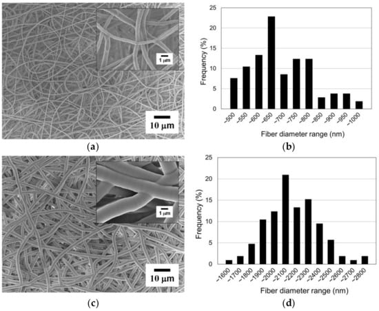 The morphology of the prepared samples was investigated using a field-emission scanning electron microscope (FE-SEM, Hitachi, Tokyo, Japan). All the specimens were coated with platinum using ion sputtering, and images were captured at acceleration voltages ranging from 5.0 kV to 10.0 kV, with magnifications up to 10,000×. The dimensions of the nano- and microfibers were measured using the ImageJ software (National Institutes of Health, Bethesda, MD, USA) based on the acquired SEM images.