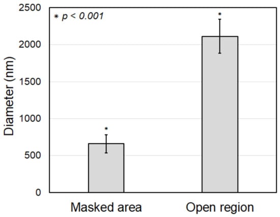 Comparison of fiber diameter of the electrospun nanofibers in between masked (i.e., original fibers) and open (i.e., coated fibers) regions.