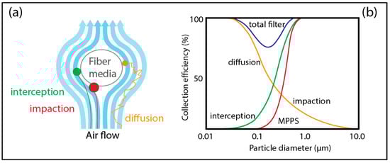(a) Main filter-capturing mechanism. (b) Filtration single-fiber efficiency and total efficiency (Author’s illustration).