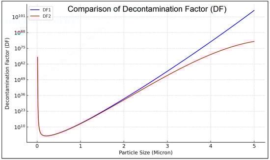 The Decontamination Factor (DF) is a measure of the efficiency of a filtration system, such as a HEPA filter, in removing particulate matter from an air stream. It is defined as the ratio of the concentration of contaminants upstream of the filter to the concentration of contaminants downstream of the filter. Figure 5 illustrates a comparison of DF values using the two modeling approaches.