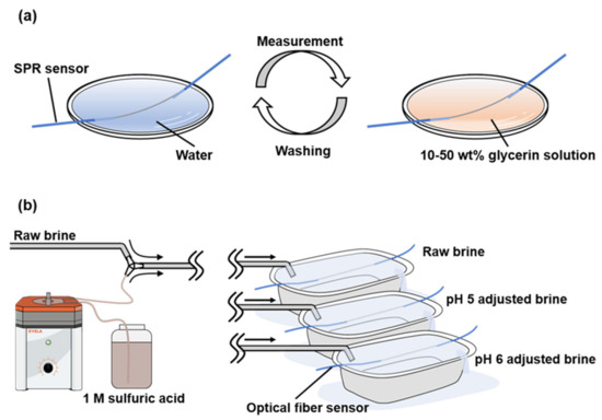The geothermal brine used in the experiments was raw; that is, it was obtained before sodium polyacrylate was injected into it as an inhibitor of carbonate minerals in the production wells. The brine was exposed to the atmosphere in a tank with an internal volume of 30 L, and flowed through a silicone tube with an inner diameter of 10 mm via a siphon-type method to a reaction vessel at a flow rate of 1 L/min. The travel time of the brine from the brine tank to the reaction vessel was approximately 20 s. One tube was prepared for the raw brine, and two tubes were prepared for the pH-adjusted brines. Then, 1 mL of 2 M sulfuric acid was added to each tube to adjust the solution pH to 5 and 6. Each optical fiber sensor was directly immersed in the brine in the reaction vessel, and scale formation was evaluated using the peak shift of the SPR absorption band (Figure 2b).