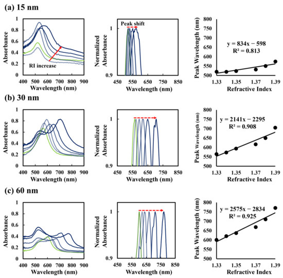 The refractive index response of sensors with different thicknesses of gold thin films: (a) 15 nm, (b) 30 nm, and (c) 60 nm. The prepared sensors were immersed in glycerol solutions with different refractive indices. The left, middle, and right columns are the obtained absorption waveforms, standardized spectra of the absorption waveforms, and changes in the peak wavelengths with changes in the refractive index, respectively.