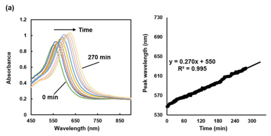 Surface plasmon resonance (SPR) is widely applied in the biosensor field because of its high refractive index sensitivity [24,25,26,27,28,29,30,31,32]. In particular, optical fiber SPR sensors are easy to handle because the SPR response is measured as an absorption wavelength. Moreover, the systems used to measure changes in peak wavelengths have low susceptibility to power supply instability, vibration, and unexpected changes in light intensity.