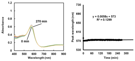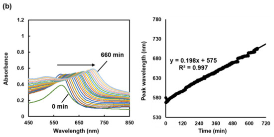 The experiment on the SPR sensor in the raw brine shows that the SPR peak linearly shifts toward longer wavelengths with time. At 270 min after sensor immersion, the SPR peak shifts by 73 nm (Figure 5a), indicating the formation of scale with a higher refractive index than that of the sensor surface. The peak wavelength of the SPR spectrum immediately after sensor immersion in the raw brine is approximately 550 nm. Combined with the results in Figure 3b, this suggests that the refractive index during sensor immersion is approximately 1.33 RIU. The decrease in the SPR peak intensity is likely due to scale formation. A linear peak shift with immersion duration is also observed in the 660 min experiment (Figure 5b). The slopes of the proximal line up to 270 min after sensor immersion in the short- and long-term experiments are approximately 0.27 and 0.198, and the coefficients of determination are 0.995 and 0.997, respectively, confirming that the SPR sensor has a highly reproducible response.