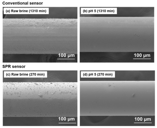 The precipitates on the sensors after the field tests were observed through SEM-EDS, and their surface morphology and chemical composition were analyzed (Figure 7 and Table 2). In the raw brine, both the conventional and SPR sensors had uniform films of deposited scale. More scale was deposited onto the conventional sensor after a long immersion period (Figure 7a). By contrast, the SPR sensor immersed in the pH 5-adjusted brine had no precipitates. The conventional sensor in the pH 5-adjusted brine had a small amount of precipitates because the sulfuric acid could not be pumped for pH adjustment in the latter half of the experiment.