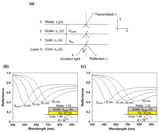 A possible reason for the shift of the SPR peak to longer wavelengths is the formation of scale films with different thicknesses associated with the immersion duration of the SPR sensor in the brine. The simulation of the sensor response was performed by using Scilab 2024.1.0. A four-layer structure (glass/gold/scale/water) was modeled to predict the extent of the peak shift using the SPR numerical method (Figure 8a). The structure consisted of glass (fiber core; 0), an SPR excitation layer (gold layer; 1), a scale layer (2), and water, i.e., brine (3). The dielectric constant of each layer was εn (n = 0, 1, 2, 3), and the thicknesses of the gold and scale layers were dAu and dscale, respectively. In the planar optical configuration shown in Figure 8a, the incident light is reflected at the interface between the core surface and the gold layer at an angle θ, satisfying the total reflection condition. With the appropriate thickness of the multilayer structure, the evanescent light produced by the total reflection can extend to the gold layer and reach the outer boundary (brine). SPR occurs when the x-direction wavenumber of the incident light coincides with that of the surface plasmon wave at the core-gold interface. The reflection coefficient of the multilayer structure in the SPR numerical calculation was calculated using a general 2 × 2 matrix formula (transfer matrix method) [35]. During the numerical calculations, the refractive indices of the cladding and the scale (talc) were set to 1.46 and 1.59, respectively, and the dielectric constant of gold was obtained from the literature [36].