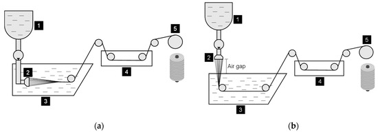General schematic representation of both (a) wet spinning and (b) dry-jet wet spinning processes: (1) spinning dope container, (2) spinneret/nozzle, (3) coagulation bath, (4) washing/stretching bath, and (5) rotating spool.