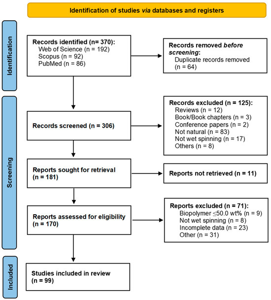 This systematic literature review was designed to identify promising bio-based raw materials to develop fibers through wet spinning or dry-jet wet spinning with tailored mechanical properties. After applying a set of specific strings in three databases, the electronic search yielded 370 articles (Web of Science = 192, Scopus = 92, and PubMed = 86), as described in Table 1. A total of 64 duplicate records (17%) were removed, and from the remaining 306 records, 125 irrelevant articles were excluded based on title and abstract. Afterwards, from the 181 reports sought for retrieval, 170 full-text articles were screened for eligibility and 71 were removed based on the fourth criterion (i.e., biopolymer ≤ 50.0 wt.%, not wet spinning, incomplete data, or others), leaving 99 articles for inclusion in the review (27%) (Figure 2 and Figure 3a). Notice that 179 records were considered outside of the scope based on two criteria: the second criterion (not natural, not wet spinning, or others), and the fourth criterion. These records account for 48% of the total manuscripts initially considered.