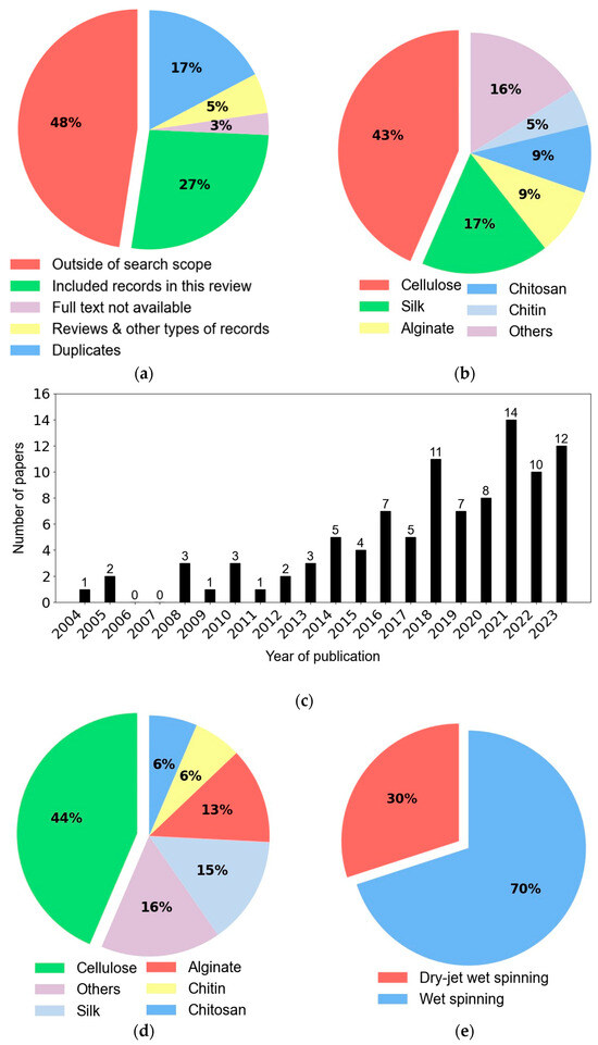 Excluded records comprised reviews (12; 3%), books chapters (3; 1%), conference papers or proceedings (2; 1%), and manuscripts not written in English (3; 1%), or not having the full text available (11; 3%). Notice that 48% (176) of the studies did not meet the inclusion criteria. The included records (99; 27%) were finally fully analyzed and important information regarding the type of raw materials and additives, dope solution characteristics, spinning process and parameters, mechanical properties, and other relevant information were extracted, and the most promising results are summarized in Table 2. Detailed information is provided in the Supplementary File (Table S1). Among the selected records for inclusion, the majority, dated from 2018 to 2023 (62; 63%), are shown in Figure 3c, and 2021 had the highest number of publications (14/62). In general, cellulose (27; 44%) was the selected raw material for producing bio-based fibers, followed by silk (9; 15%), alginate (8; 13%), chitin (4; 6%), chitosan (4; 6%), and other natural polymers, namely α-1,3-glucan (2; 3%), carrageenan (2; 3%), agar (1; 2%), collagen (1; 2%), gelatin (1; 2%), keratin (1; 2%), lignin (1; 2%), and ulvan (1; 2%) (Figure 3d). Overall, the wet spinning technique was widely preferred for producing bio-based fibers; 70% of the included studies reported using the wet spinning process, while 30% used dry-jet wet spinning (Figure 3e).