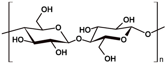 Cellulose (CE) is the most abundant renewable polymer, and has attracted attention owing to its outstanding properties, such as biocompatibility, biodegradability, thermal and chemical stabilities, and recyclability [1,32,33]. CE can be extracted from both wood and non-wood sources. While wood has traditionally been the predominant source of CE for industries, other non-wood resources, including agricultural waste, fibers (e.g., cotton, flax, jute, among others), marine animals, algae, and bacteria, are gaining increased interest [34,35]. In particular, agricultural waste stands out as a significant non-wood source, accounting for over 85% of cellulose, hemicellulose, and lignin content [36]. CE is a linear homopolymer composed by β-D-anhydroglucopyranose monomeric units linked by β-(1→4)-glycosidic bonds, with cellobiose as the repeating stereoregular unit, Figure 4 [32,36,37].
