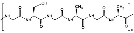Silk is a lightweight structural material, produced in nature by silkworms and spiders [83,84]. It is composed of two major proteins—fibroin (70%) and sericin (25%)— and minor impurities (5%) [84]. The silk structure mainly comprises two silk fibroin (SF) fibers covered by a sericin layer containing small non-protein impurities [84]. Sericin is a water-soluble protein with a disordered spatial structure, which promotes lubrication, protection, and adhesion in cocoon silk [84]. SF is a fibrous protein composed of a heavy chain (H-chain) (390 kDa), light chain (L-chain) (26 kDa), and glycoprotein P25 (30 kDa) at a molar ratio of 6:6:1 [84,85]. The larger H-chain is glycine (Gly) rich, and most of its amino acid composition consists of Gly, alanine (Ala), and serine (Ser), Figure 5.