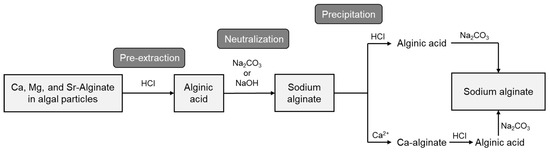 Commercial alginate is predominantly extracted from the brown algae Laminaria, Macrocystis, and Ascophyllum [109]. The procedure for ALG extraction from algae, Figure 6, is divided into three main steps: (1) pre-extraction, (2) neutralization, and (3) precipitation.