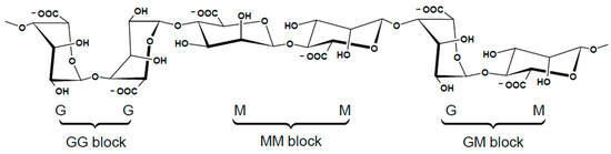 This biomaterial is a copolymer with an anionic charge formed by 1,4-glycosidic bonds between the monomers β-D-mannuronic acid (M) and α-L-guluronic acid (G) [106,111]. These two acids differ stereochemically at carbon C5 and, depending on the natural source and extraction process, they are arranged in the linear alginate chain in consecutive homopolymeric blocks (MM and GG) or heteropolymeric blocks (MG), Figure 7 [112,113].