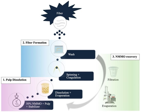 Courtaulds Fibres was the first commercial L-MMCF fibre manufacturer [1,3,12]. They started pilot work in the early 1980s. Lenzing optimized the process and is currently the leading global lyocell producer. Other manufacturers, such as the Thuringian Institute for Textile and Plastics Research (TITK) Rudolstadt (research facility, lab- and pilot-scale production), Akzo Nobel, Greencell, Grasim, Shanghi Leo, Baoding Swen, Xinxiang Bailu, and Shandong Yingi, have more recently released products to the market [1,3,6,12,13]. There is also Birla Cellulose, which manufactures L-MMCF under Birla Excel™. The popularity of L-MMCF is trending upward, with a projected compound annual growth rate (CAGR) of 7.0% from years 2024 to 2030 [14,15]. The L-MMCF production process includes three main steps: pulp dissolution, fibre formation, and NMMO recovery (Figure 2).