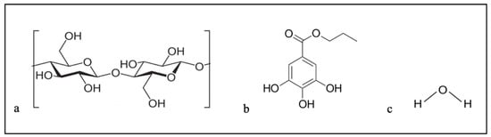 Chemical structure of cellulose (a), PG (b), and water (c).