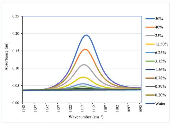 Figure 6 shows the FTIR spectra in the 1092–1142 cm−1 area for 50 wt%, 40 wt%, 25 wt%, 12.5 wt%, 6.25 wt%, 3.125 wt%, 1.56 wt%, 0.78 wt%, 0.39 wt%, and 0.195 wt% aqueous NMMO solutions (by volume) and MilliQ water. They show a gradual increase in the 1116 cm−1 peak height as the NMMO concentration in the aqueous solution increases.