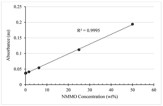 Based on the conclusions of the comparison between the different characterization techniques in Section 4.1, FTIR was explored as a technique to quantify the NMMO content in lyocell fibre wash wastewater. It has been used by Luo et al. to determine the cellulose, water, and NMMO content in lyocell slurries [76]. However, the authors applied the angle spectrum (CASAS) and partial least squares (PLS) models to the absorption spectra to extract the content information. As a result, there is potential for a simplified FTIR-based NMMO quantification method that would be applicable for industrial use.