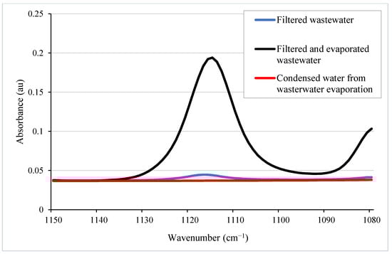 The strategy selected for NMMO content quantification by FTIR relied on molecular functional groups found in NMMO but not in the other compounds present in the lyocell fibre wash wastewater. A C-N tertiary amine bond is present in the NMMO chemical structure (Figure 1), which is not present in cellulose, PG, and water (Figure 4). This C-N tertiary amine bond has been associated with an absorbance in the range of 1100–1200 cm−1 [77,78,79]. The experiments conducted involved three steps. First, the spectrum of samples of NMMO solution, water, cellulose pulp, and PG (used to limit NMMO thermal degradation) were analyzed by FTIR to confirm the choice of the selected peak. Second, a calibration curve was constructed by measuring several serial dilutions of NMMO in water. Finally, the NMMO content in lyocell fibre wash wastewater was measured before and after NMMO recovery treatment by evaporation.