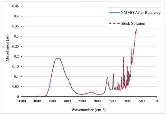 The FTIR spectrum of the NMMO/water solution recovered by rotary evaporation from the L-MMCF production wastewater was compared to that of the 50 wt% NMMO/water stock solution. As shown in Figure 9, the two spectra perfectly overlap in the 600–3600 cm−1 range (R-square of 0.99997). This indicates that NMMO had not experienced any significant degradation during the recovery process from the L-MMCF production wastewater by rotary evaporation. The amber colour observed in the evaporated wastewater was potentially due to PG chromophore formation, which would not produce a large effect on the FTIR spectrum due to the low PG content. The same amber colour was observed in the NMMO/water/cellulose/PG dope after it had been evaporated to increase the NMMO concentration from 50 to 85 wt% [8].
