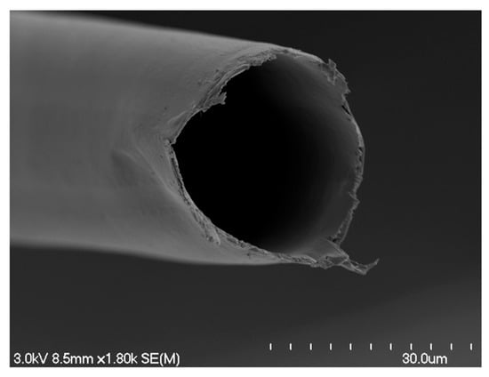 Milkweed fibers were supplied by Coop Monark. The fiber density was equal to 0.30 g/cm3 [13].The average diameter, length, and thickness measured by SEM were equal to 22 ± 6 μm, 25 ± 3 mm, and 1.50 ± 0.23 μm, respectively. Figure 1 shows the hollow structure of a milkweed fiber. PLA fibers were purchased from Ingéo Nature Works. Their density was equal to 1.26 g/cm3.