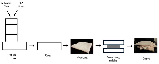 To process carpets from nonwovens, it was necessary to process the nonwovens using a SPIKE system with milkweed fibers and PLA fibers in a weight ratio of 75 to 25. During the air-laid process, a 10% loss of milkweed fibers was calculated due to their volatile nature, which was significantly better than the carding process. Indeed, Gharehaghaji and Davood observed a 50% fiber loss during the carding process of a nonwoven composed of 90% Estabragh and 10% PET fibers [34]. This difference is explained by the fact that the air-laid process was carried out in a closed chamber and the carding process in an opened chamber. Figure 2 displays a scheme of nonwoven and carpet manufacturing using the air-laid process.