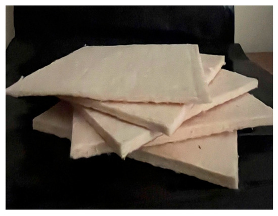 A nonwoven with a mass per unit area of 150 g/m2 and a thickness of 15 mm was obtained. Afterwards, different nonwoven layers were overlaid using a Teflon mold and compressed into a hydraulic hot press in order to obtain some floor coverings of varying mass per unit area for the same thickness. A pressure of 0.5 tones and a temperature of 200 °C were applied on the mold for 2 min. The nonwoven process aimed to stabilize the PLA matrix for three-dimensional stability, while the carpet production aimed to melt the PLA fibers without any damage. Based on the melting temperature of PLA and the degradation temperature of milkweed, a temperature of 200 °C was selected to ensure the complete fusion of the PLA without any degradation of milkweed. Figure 3 shows the different carpets.