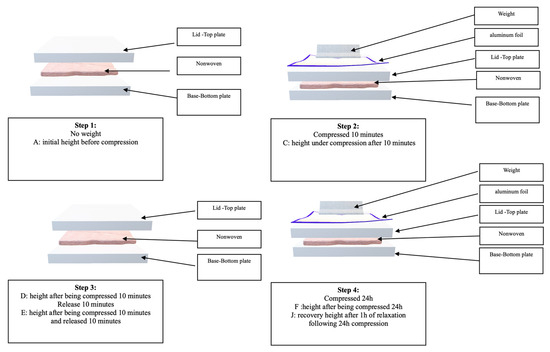 Step 4: The weight was added once again for 24 h. Then, the nonwoven was taken off, and the height, F, which is the average height after being compressed during 24 h, was measured. Finally, the nonwoven was left untouched for 1 h, and (J), the average recovery height, was estimated.