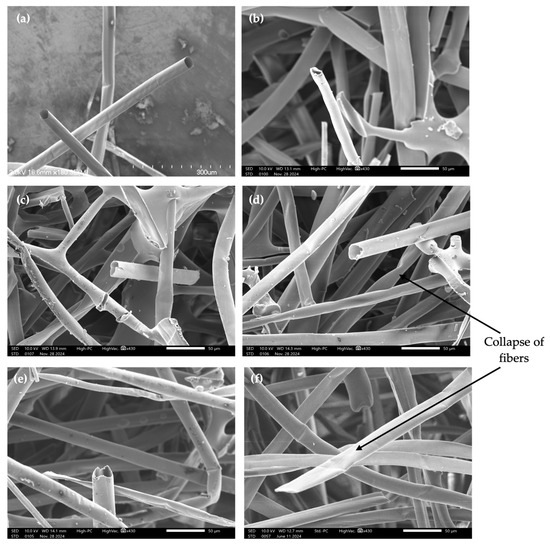Figure 5 shows SEM images of milkweed fibers taken from the UC nonwoven (a) and the morphology of fibers for C1, C2, C3, C4, and C5 (b to f). It can be observed that the structure of fibers extracted from the UC nonwoven is preserved, which shows that the air-laid process does not affect the fiber integrity. Figure 5b–f illustrate that some milkweed fibers collapsed, while others maintained their hollow structure, resulting from the thermocompression step.