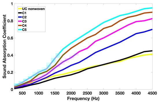 Figure 6 shows the sound absorption coefficient for the UC nonwoven and the different carpets at frequencies ranging from 250 to 4500 Hz.