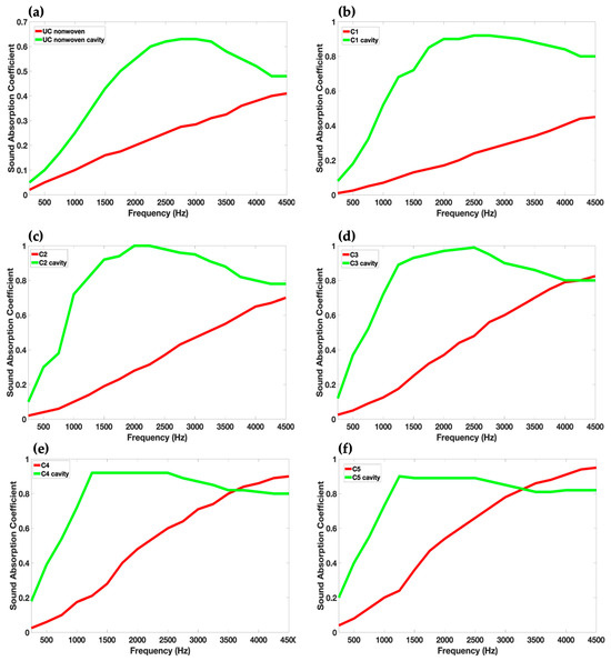 Sound absorption coefficient values versus the frequency for the nonwoven and the carpets with and without a 30 mm deep cavity, (a) the UC nonwoven, (b) C1, (c) C2, (d) C3, (e) C4, (f) C5.